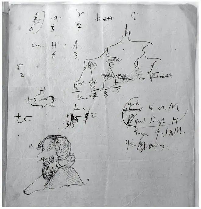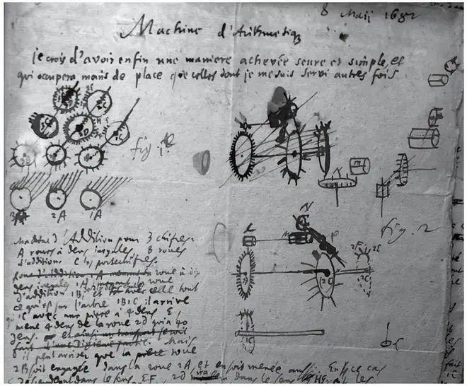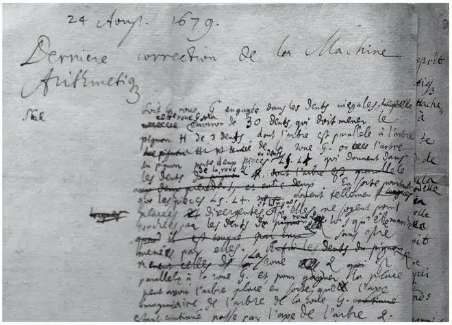 莱布尼兹1679年用法语写下的“算术机的最后修正”及1682年自己起草的设计图