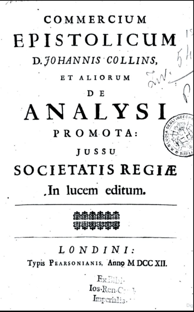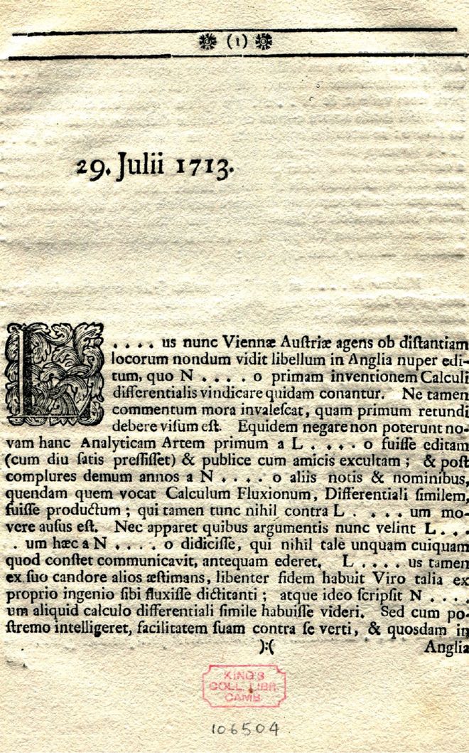 1712年,英国皇家学会成立了一个调查牛顿—莱布尼兹微积分优先权的专门委员会,委员会实际上处于牛顿的操纵之下。1713年初,委员会发布公告: 确认牛顿是微积分的第一发明人。莱布尼兹向英国皇家学会提出申诉,并自己起草和印发了一份《快报》,指责委员会的严重不公。
